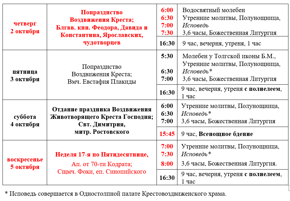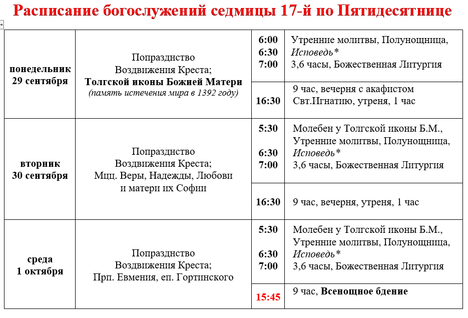 Расписание богослужений седмицы 17-й по Пятидесятнице