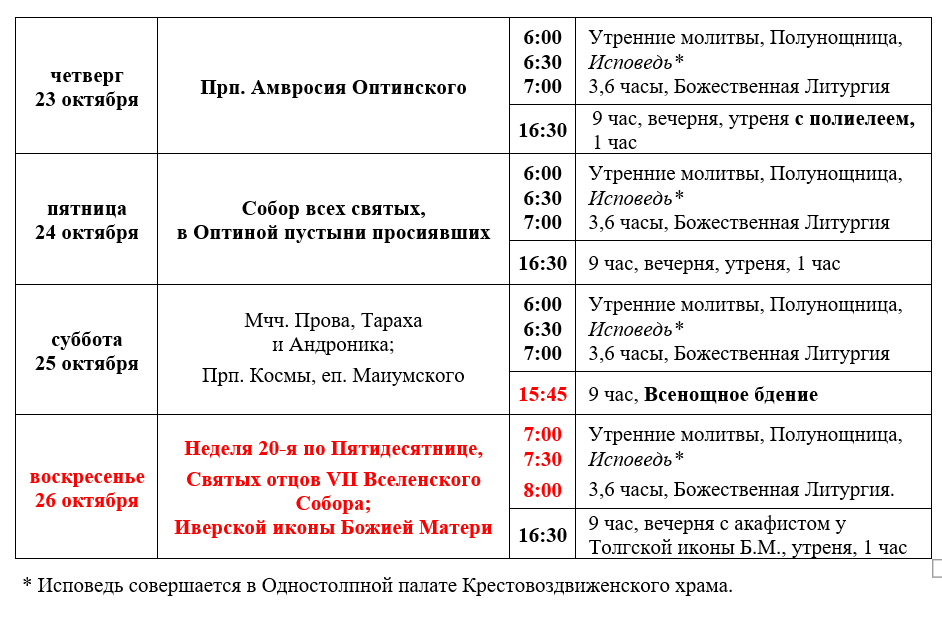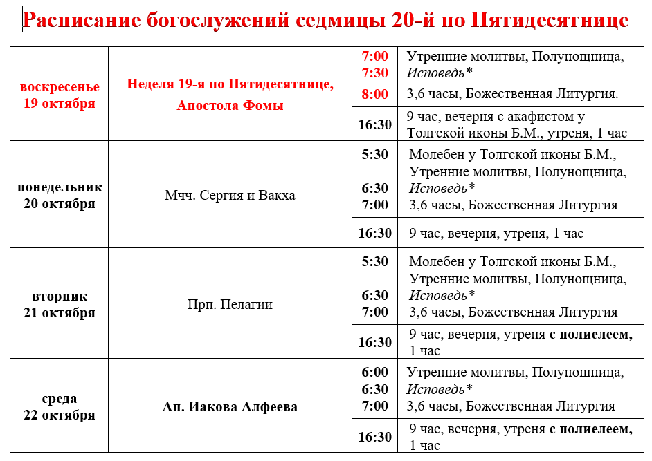Расписание богослужений седмицы 20-й по Пятидесятнице