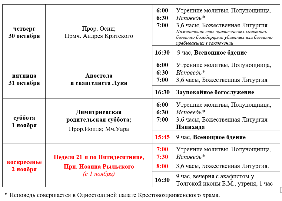 Расписание богослужений седмицы 21-й по Пятидесятнице