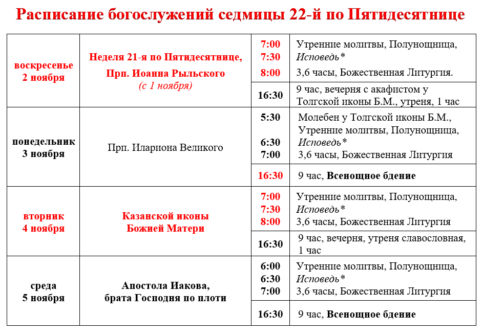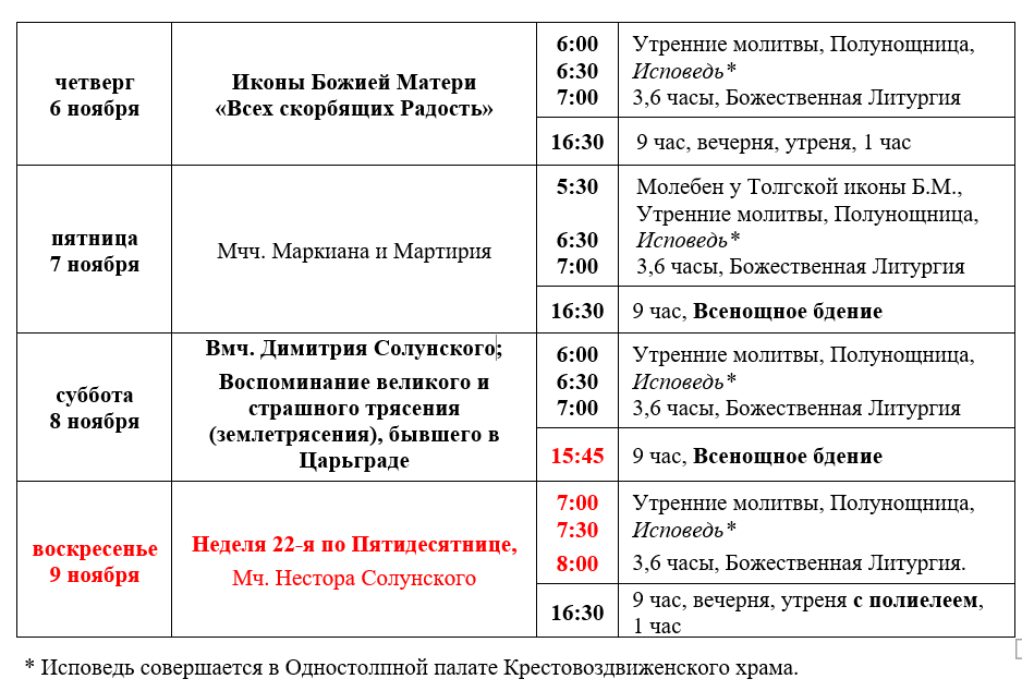 Расписание богослужений седмицы 22-й по Пятидесятнице