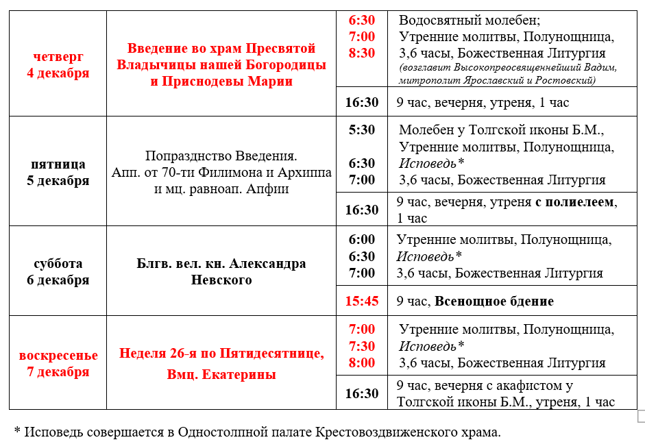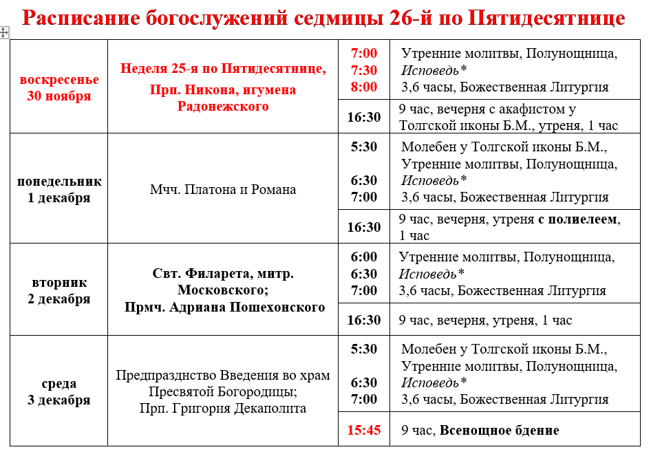 Расписание богослужений седмицы 26-й по Пятидесятнице