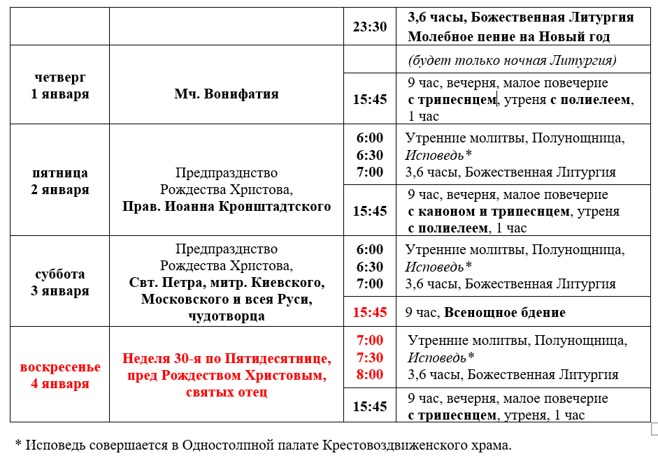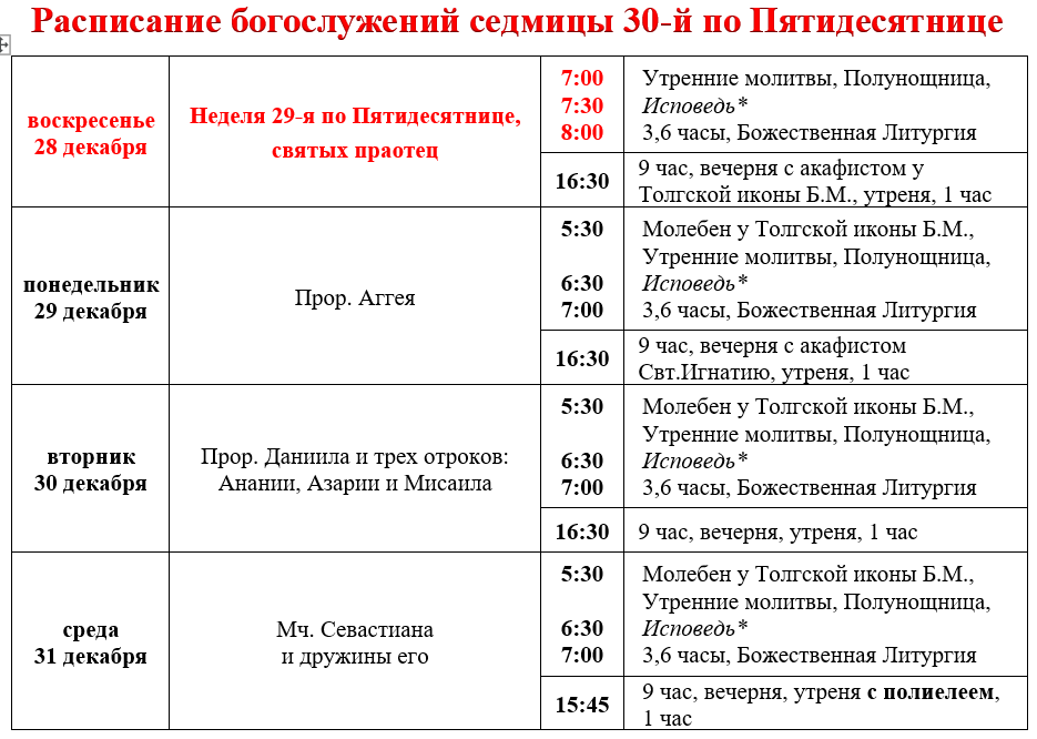 Расписание богослужений седмицы 30-й по Пятидесятнице