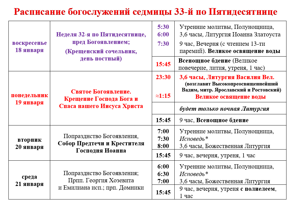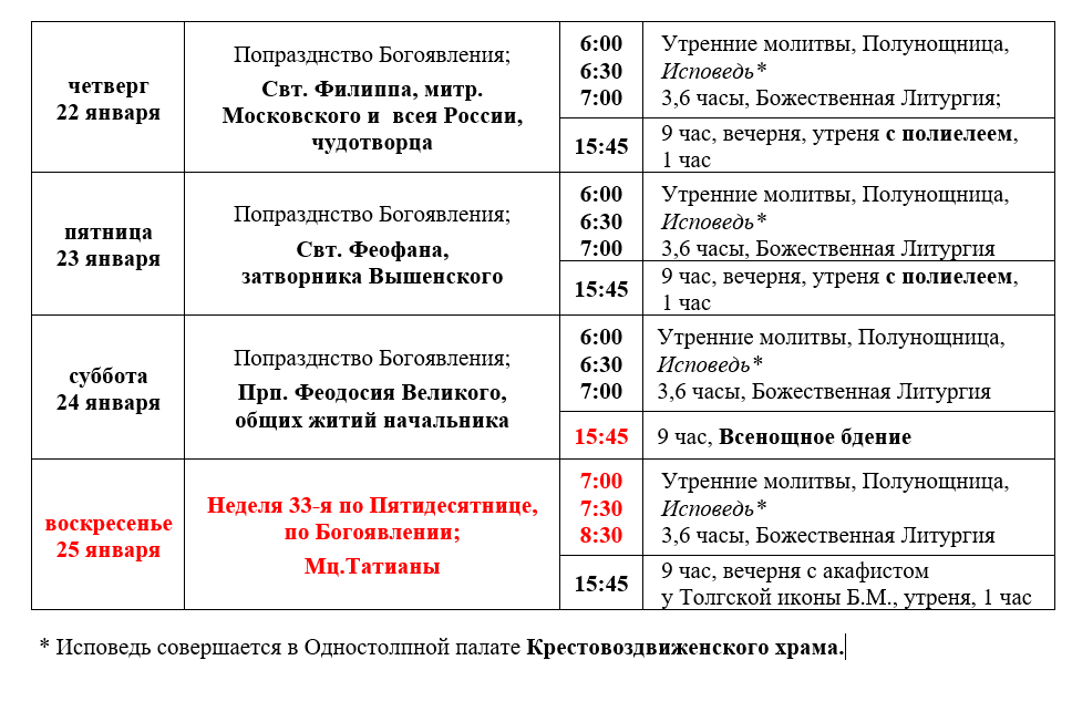 Расписание богослужений седмицы 33-й по Пятидесятнице