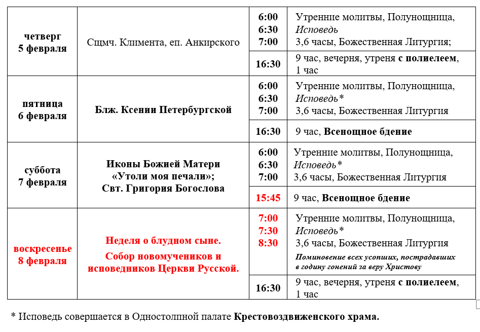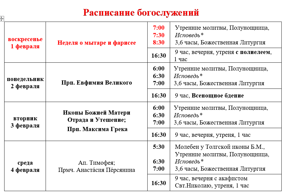 Расписание богослужений в неделю о мытаре и фарисее