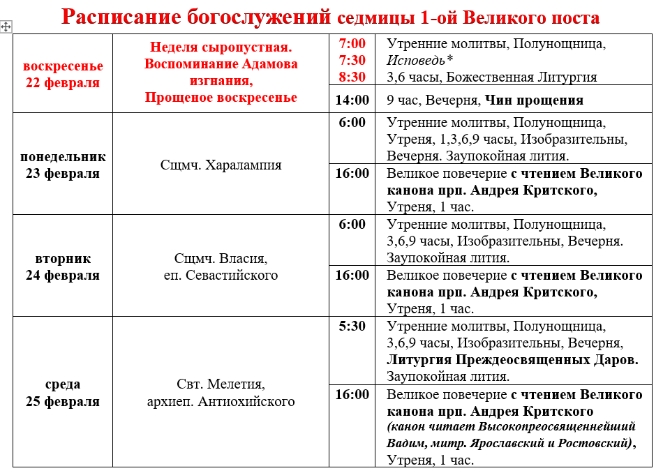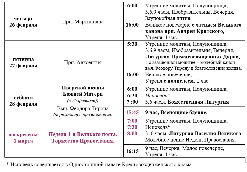 Расписание богослужений седмицы 1-й Великого поста
