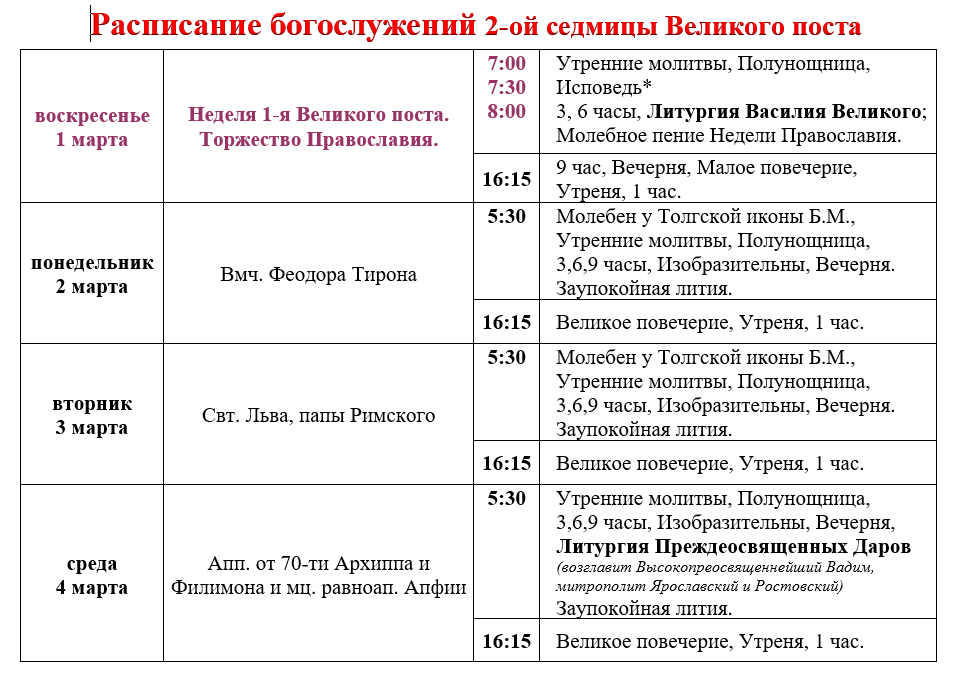 Расписание богослужений 2-й седмицы Великого поста