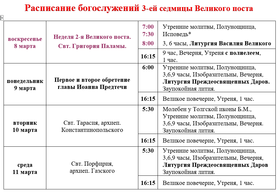 Расписание богослужений седмицы 3-й Великого поста