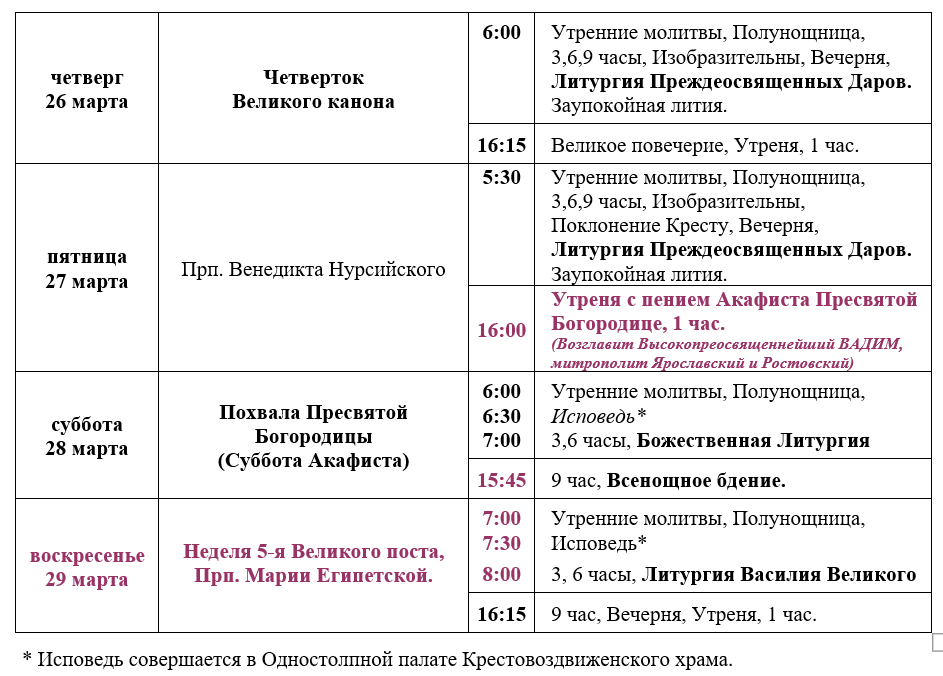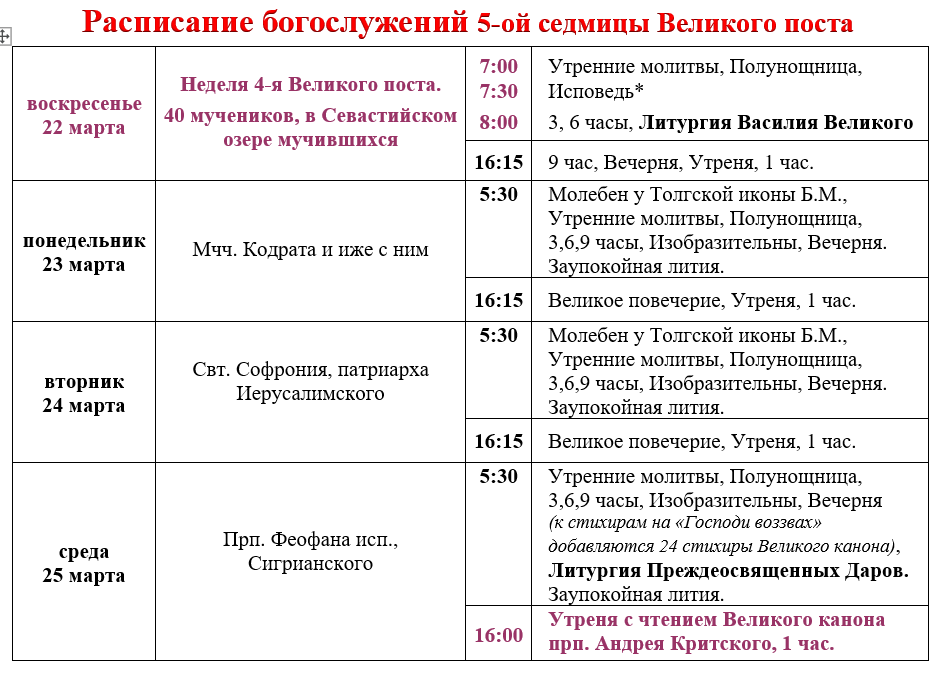Расписание богослужений седмицы 5-й Великого поста