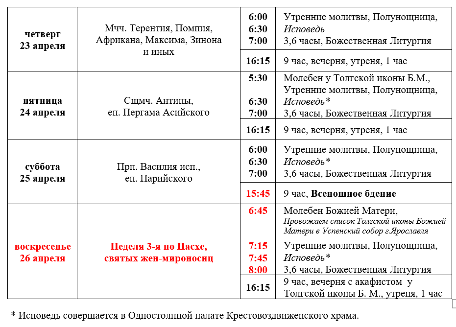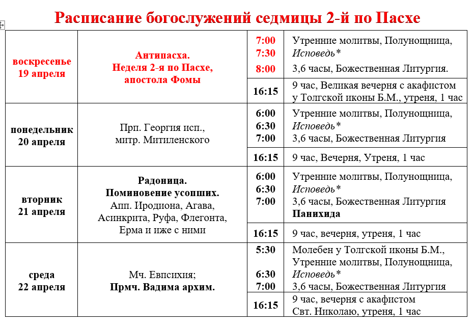 Расписание богослужений седмицы 2-й по Пасхе