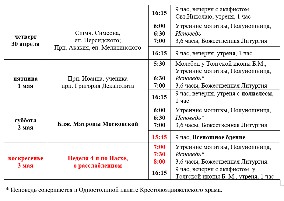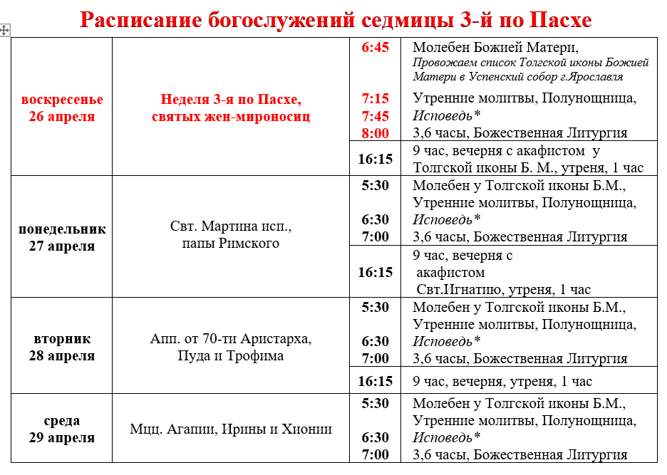 Расписание богослужений седмицы 3-й по Пасхе